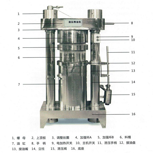 結合下圖,下面我們對應液壓榨油機的結構詳細介紹一下各部件的功能與作用