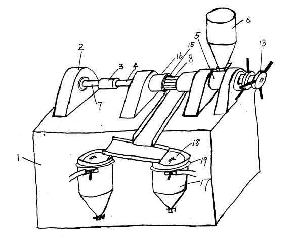 螺旋榨軸穿過料筒,并通過連軸節與減速箱動力輸出軸相連,螺旋榨軸的錐型前端和料筒前端的錐型縮口相配合形成擠出間隙,料斗放置在料筒上,并與料筒連通,螺旋榨軸的螺牙直徑保持恒定,螺旋榨軸螺谷從后端到前端逐漸變低,出渣口處有一錐型收縮口,通過螺旋榨軸的轉動,從料斗下來的原料沿螺谷向前運動,并逐漸受到擠壓和摩擦,在料筒的錐型收縮口,擠壓加劇,油渣分離。油從料筒的出油口段流出,出油口段上加工有可以漏油的小孔或者縫隙,油渣從料筒錐型口擠出,錐型口處料筒和螺旋榨軸的擠出間隙可以通過螺旋榨軸后端和料筒后端之間的調節螺絲/螺母進行調節,螺旋榨軸的后端設有活動連接的螺絲,該螺絲和料筒上的固定螺母配合,螺母和料筒制成一體,料筒周邊安裝有加熱元件。加熱元件外包保溫材料,同時安裝有自動恒溫裝置對料筒周邊的加熱元件進行溫度控制,螺旋榨油機還帶有真空濾油儲油罐,這樣使榨油過程和原料加熱同時進行,并將出油溫度控制在適宜溫度,改變了油品質量,減少了油的加工環節。